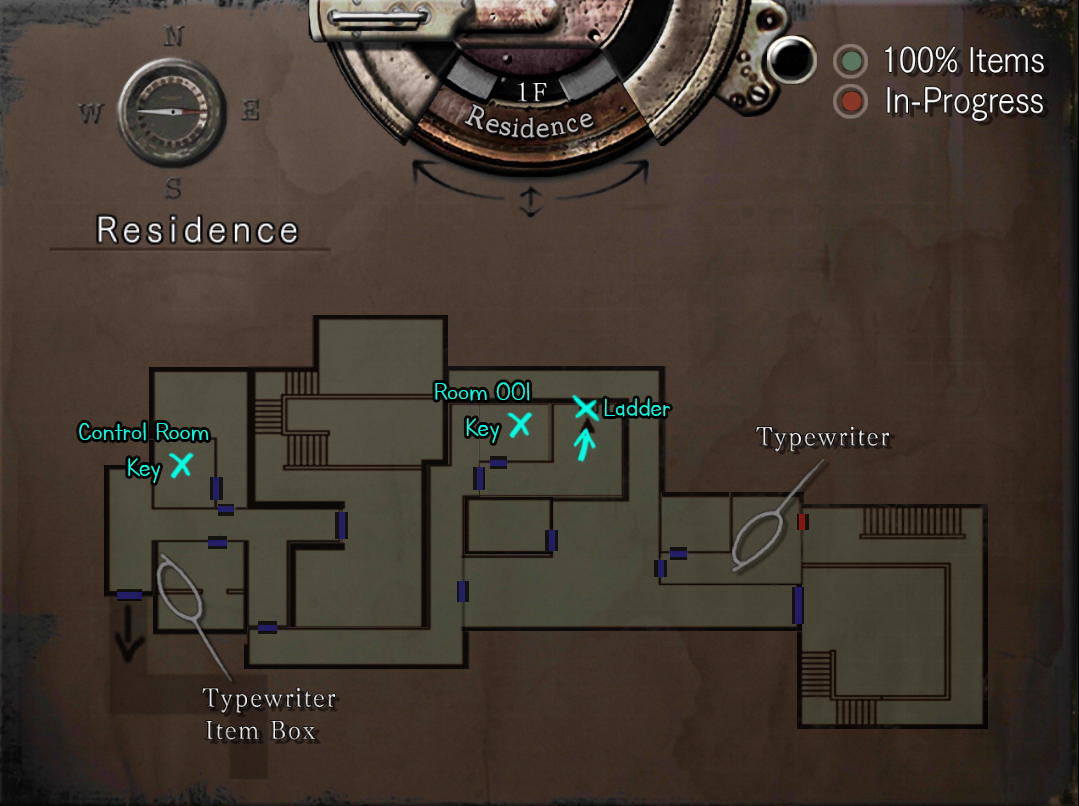 Return to the Main Hall, and take the stairs to the upper west side of this room (above door from the dining room) there are double doors, proceed through them. Avoid the zombie and you need to go into the Sword Key locked door farthest down the right. There are two zombies in the room, one coming up from the stairs and the other around the corner past the stairs. Don't go through the first door you see, although you can unlock it now. You'll notice a zombie on the floor after heading down the stairs, and it'll be back if you don't dispose of it. For now, don't worry about it. Enter the door next to the body and you'll be in a Safe Room. Deposit whatever you don't need, but be sure to keep your handgun and some ammo and the Sword Key. Come back out the Safe Room and go the way you haven't gone yet. There are 2 doors, both locked. You'll need an Old Key to open the door on the right, and the Armor Key to open the one at the end of the hall. Do yourself a favor and unlock the door at the end of the hall on the top of the stairs for a shorter path.